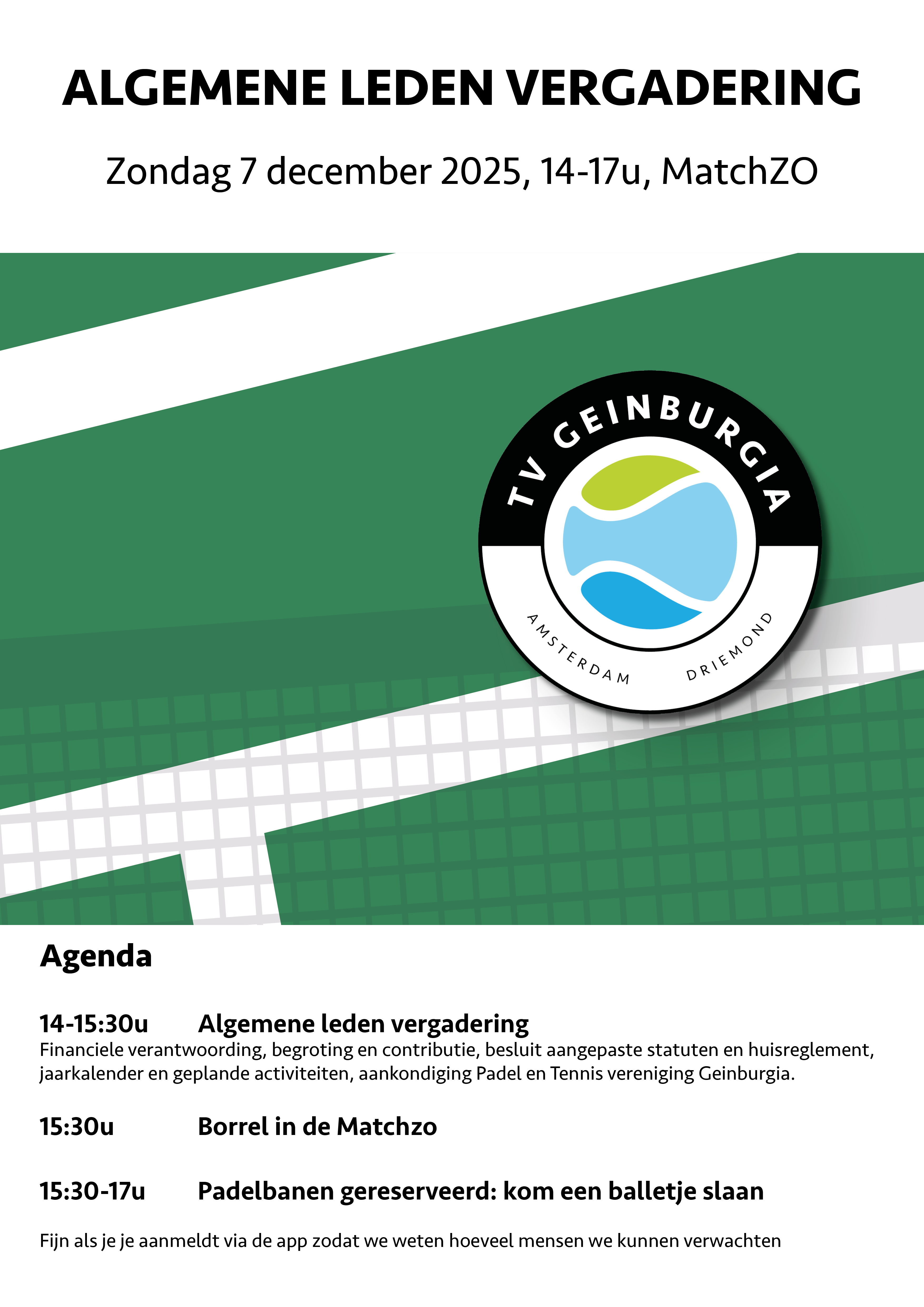 Financiele verantwoording, begroting en contributie, besluit aangepaste statuten en huisreglement, jaarkalender en geplande activiteiten, aankondiging Padel en Tennis vereniging Geinburgia.